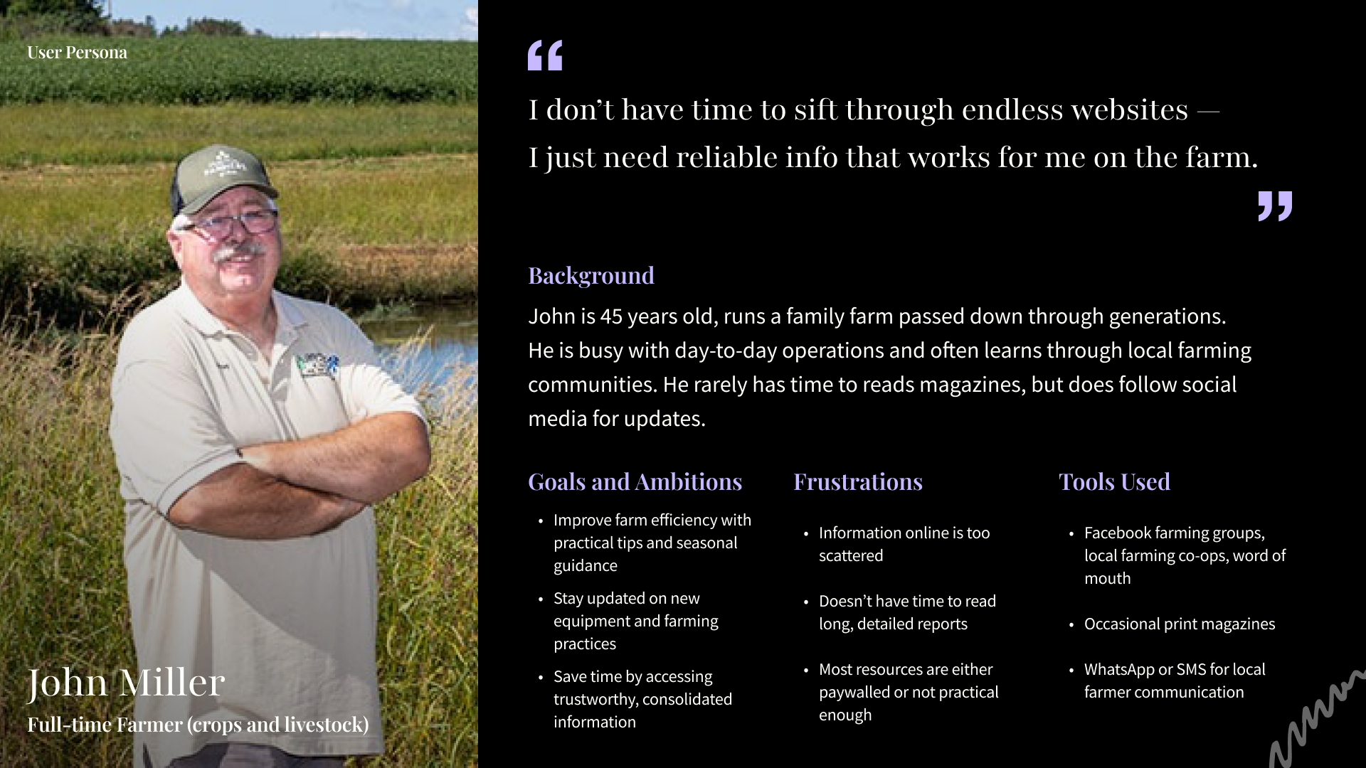 Users struggle to find reliable farming content due to cluttered navigation and information being spread across multiple platforms. This makes it time-consuming and frustrating to access what they need, especially when combined with confusing subscriptions and a lack of personalized content.