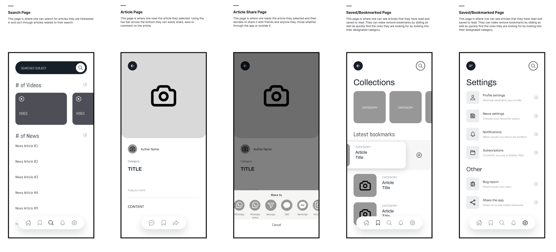 Wireframes were created in Figma to map out the app’s layout and user experience. The focus was on building a clear and simple structure, prioritizing easy navigation and content readability. Key screens such as the home feed, article page, and search were designed in low-fidelity first, allowing for quick adjustments before moving into the final design.