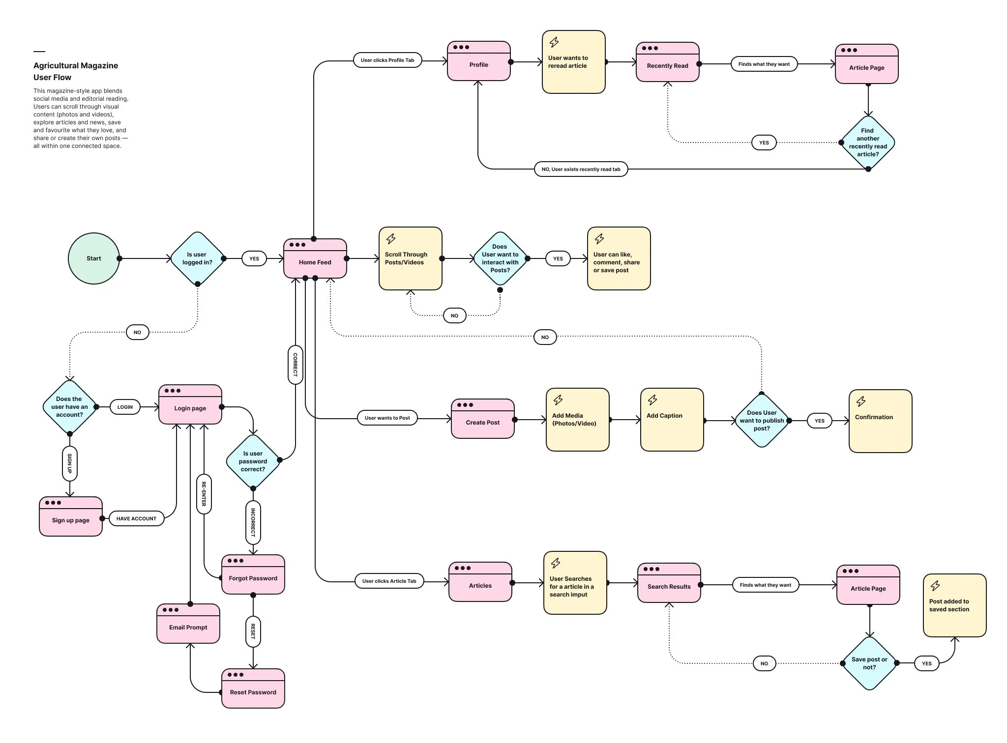 The user flow was designed to be simple and intuitive, allowing users to quickly find and engage with content. Users can easily browse a personalized home feed, search or explore categories, and select articles to read. From there, they can bookmark content, interact with posts, or continue exploring without disruption. The flow focuses on minimizing steps and creating a smooth, efficient experience.